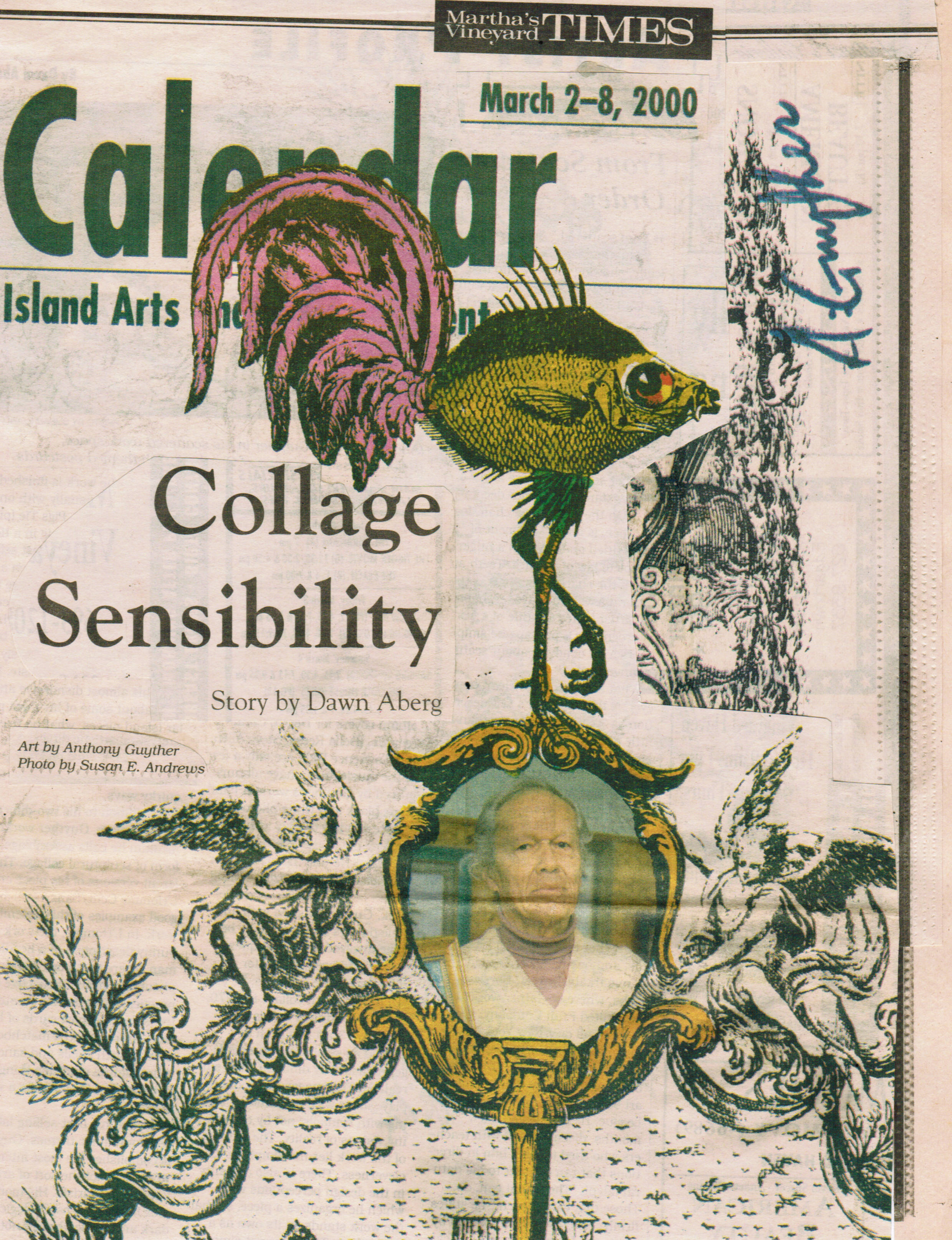 “I am scattered,” Anthony Guyther says, a little apologetically, showing the way into his home and work space. It is a wonderland of quirky design and collage sensibility. The presentation is overwhelming. Framed pieces abound: on the walls, stacked neatly on the floors, covered in heaps in corners. Small antiques and collectibles grace every available surface, along with work Guyther sells to tourists in the summer. The viewer is not sure whether some pieces are art or a happenstance of interior decoration. On the seat of one chair, for instance, is an arrangement of small dried crabs within a huge complete jaw of a shark. Teeth and all. “If the shark doesn’t get you, the crabs will,” he says. Perhaps the artist states the title of a work in progress. Or perhaps he simply offers a bit of advice about seating arrangements.